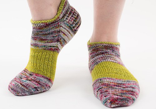 Larch Peds, designed by Laura Nelkin, are a pair of short socks that will have you addicted! The socks use short rows for shaping, so they're a great way to learn some new skills. There are 8 size options for a perfect fit. Choose a fun contrast color for the cuff and arch.